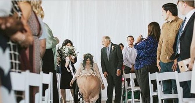 Момент, когда невеста идет к алтарю — под руку с отцом и глядя на ждущего ее жениха, — всегда очень трогательный. И у этой пары он тоже был особенным.25-летняя Джеки Гончер была парализована от шеи до ног еще с 17 лет.После травмы позвоночника еще когда она занималась плаванием, врачи сказали, что скорее всего она больше никогда не сможет ходить. Для Джеки, как для бывшей спортсменки, очень тяжело было смириться с тем, что она больше не может сделать даже банальные вещи.