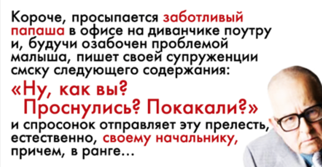 «Ну, как вы? Проснулись? Покакали?» и спросонок отправляет эту прелесть, естественно, своему начальнику, причем, в ранге директора ИТ управления…