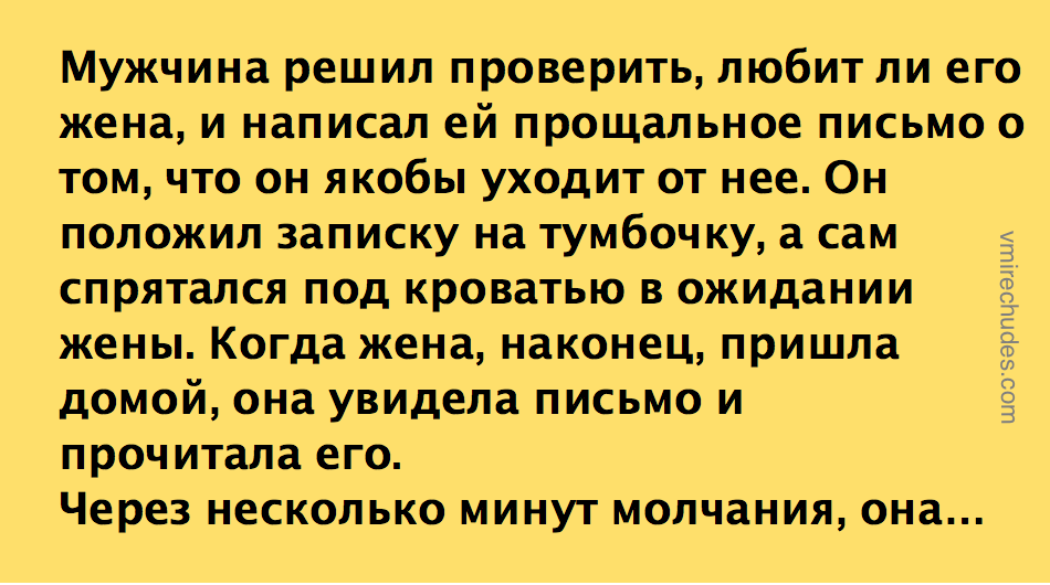 Один мужчина решил проверить, любит ли его жена, и написал ей прощальное письмо о том, что он якобы уходит от нее. Он положил записку на тумбочку, а сам спрятался под кроватью в ожидании жены.