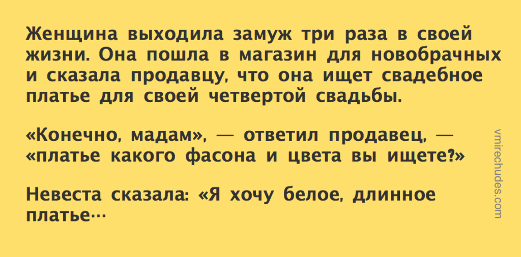«Хорошо,» — ответила клиентка, немного злая на продавца за его прямоту, — «Но я могу заверить вас, что белое платье будет вполне уместно. Верите мне или нет, но несмотря на все мои браки, я по-прежнему невинна. Видите ли, мой первый муж был так взволнован нашей свадьбой, что он умер, как только мы зарегистрировались в нашем отеле. Со вторым мужем мы так сильно поссорились в лимузине по дороге в наш медовый месяц, что мы сразу расстались и больше никогда не общались друг с другом».