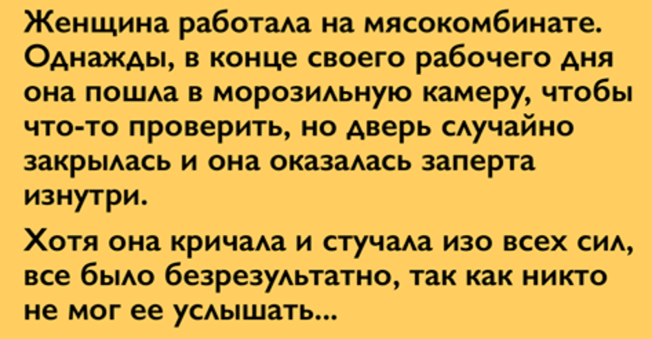 Женщина работала на мясокомбинате. Однажды, в конце своего рабочего дня она пошла в морозильную камеру, чтобы что-то проверить, но дверь случайно закрылась и она оказалась заперта изнутри.