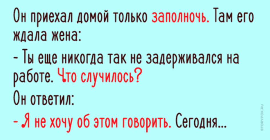 Наконец, наступила полночь. Мужчина вздохнул с облегчением и поехал домой. Там его ждала жена: