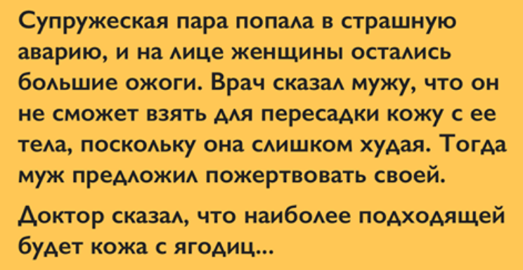 Доктор сказал, что наиболее подходящей будет кожа с ягoдиц. Муж с женой договорились, что они никому не скажут, откуда взяли кожу, и попросили доктора сохранить их секрет. Ведь, в конце концов, это очень дeликатный вопрос.