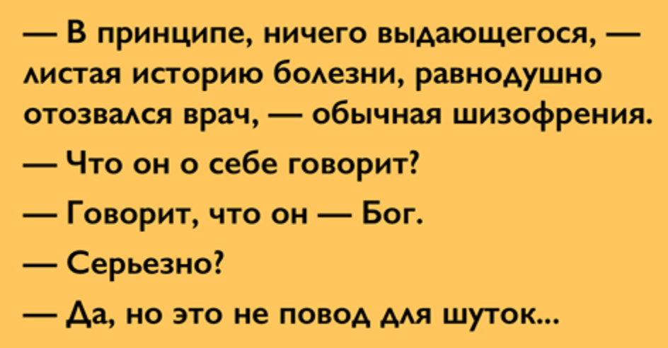 — Замечательно, — врач поправил очки на носу и сделал пометку в истории болезни, — раз вы утверждаете, что вы — Бог, не могли бы вы это доказать? Совершить какое-нибудь чудо, например?