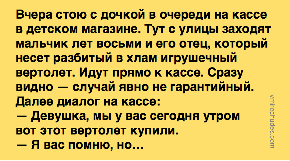 Вчера стою с дочкой в очереди на кассе в детском магазине. Тут с улицы заходят мальчик лет восьми и его отец, который несет разбитый в хлам игрушечный вертолет. Идут прямо к кассе. Сразу видно — случай явно не гарантийный. Далее диалог на кассе: