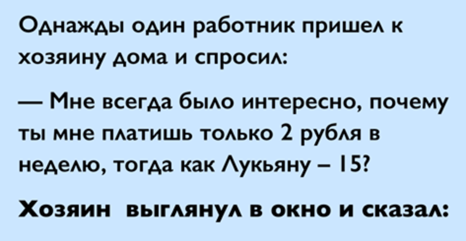 — Мне всегда было интересно, почему ты мне платишь только 2 рубля в неделю, тогда как Лукьяну – 15?Хозяин помолчал, выглянул в окно и сказал: