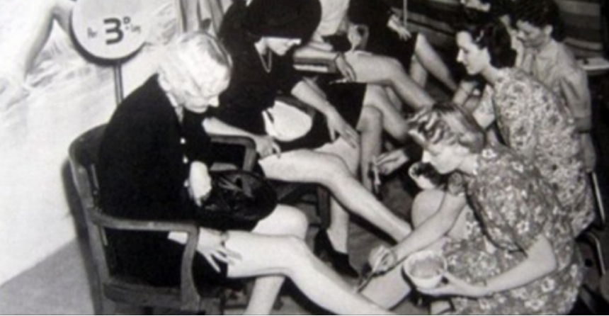 Женщинами, как всегда, был найден выход из этой ситуации. Кожу на ногах тонировали, предварительно избавившись от волосков при помощи бритвы, а затем ее разрисовывали «под чулки». Многие салоны красоты предлагали соответствующие услуги.