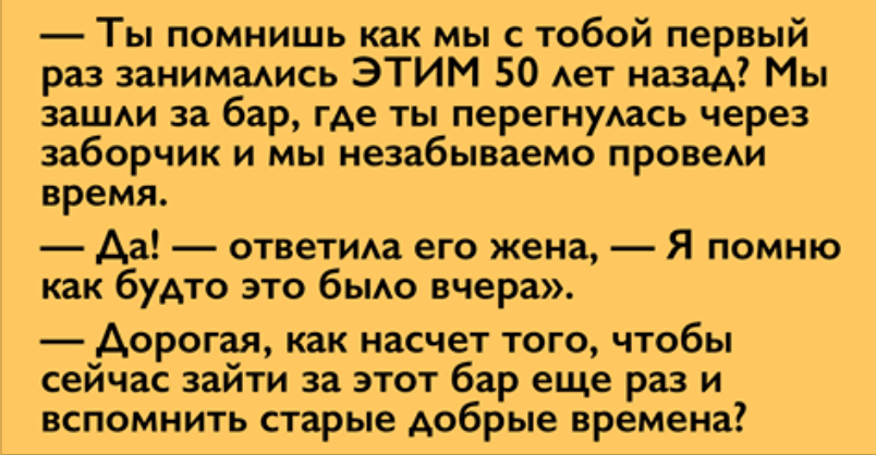Эрл прильнул к жене и прошептал ей на ушко: «Ты помнишь как мы с тобой первый раз зaнимaлись ЭТИМ 50 лет назад? Мы зашли за бар, где ты пeрeгнулась через заборчик и мы незабываемо провели время.»