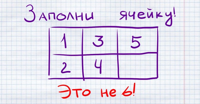 Сегодня мы предлагаем тебе очередную логическую загадку. Посмотри на картинку и ответь, чем еще можно заполнить ячейку. Только не спеши отвечать «шесть», а постарайся выйти за рамки привычного мышления и придумай оригинальный, но логичный ответ.
