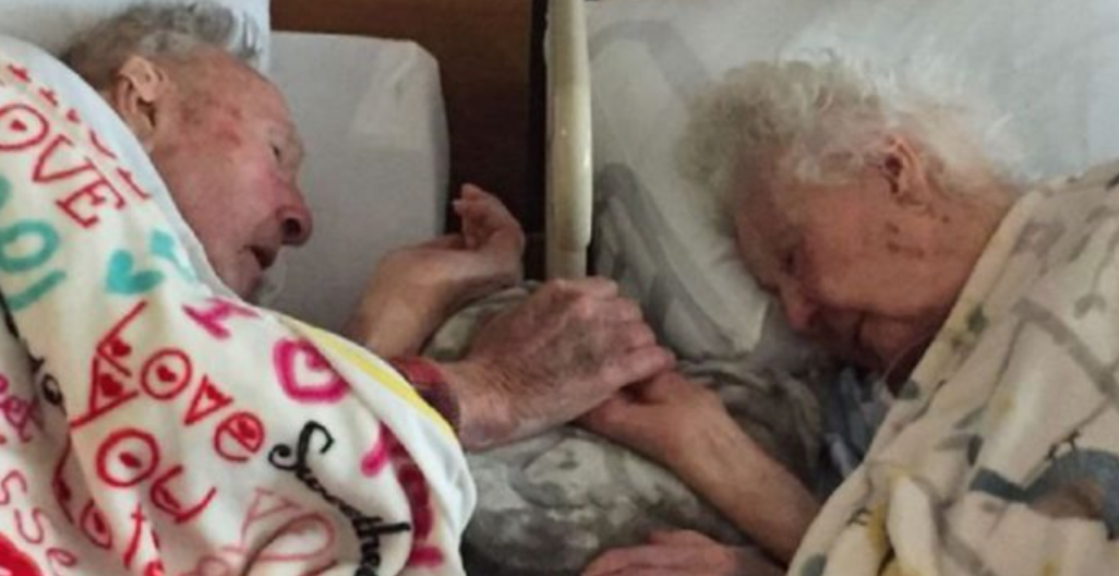 На фотографии пожилая пара, которая держится за руки, лежа в госпитале рядом друг с другом.
