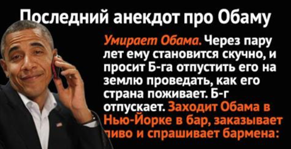 Обама радостный, гордый и довольный допивает пиво и говорит:
