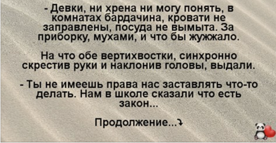 — Девки, ни хрена ни могу понять, в комнатах бардачина, кровати не заправлены, посуда не вымыта. За приборку, мухами, и что бы жужжало.