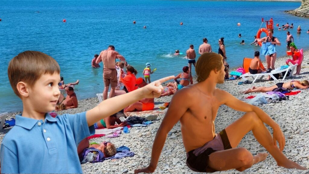 На мальчонке был надет надувной круг для плавания в виде пончика, а в обеих руках он держал игрушки — парусник на дистанционном управлении и ведерко для песка с совочком.
