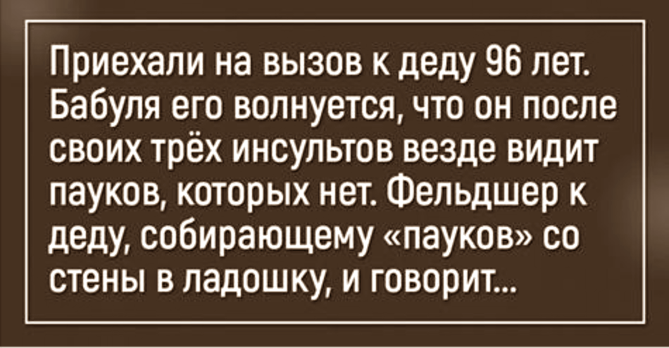 Приехали на вызов к деду 96 лет. Бабуля его волнуется, что он после своих трех инсультов везде видит бегающих пауков, которых нет. Мой фельдшер к деду, собирающему «пауков» со стены в ладошку: