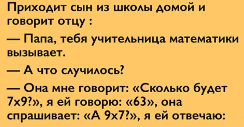 — Она мне говорит: «Сколько будет 7х9?», я ей говорю: «63», она спрашивает: «А 9х7?», я ей отвечаю: «Какая, на х..й, разница?»…