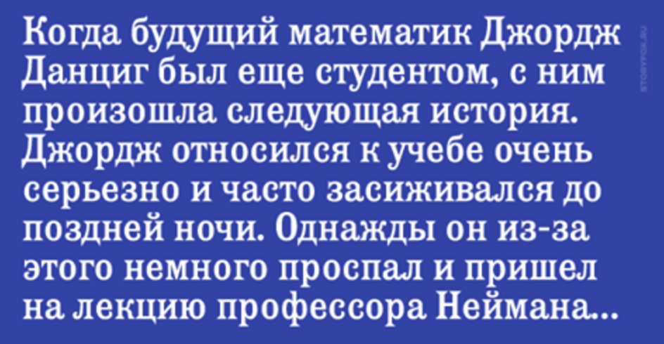 Когда будущий математик Джордж Данциг был еще студентом, с ним произошла следующая история. Джордж относился к учебе очень серьезно и часто засиживался до поздней ночи. Однажды он из-за этого немного проспал и пришел на лекцию профессора Неймана с 20-минутным опозданием.