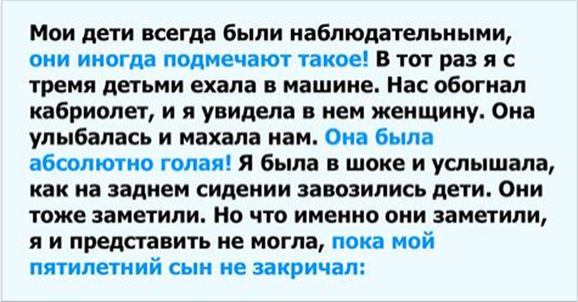 «Мои дети всегда были очень наблюдательными, они иногда подмечают такое! В тот раз я с тремя детьми ехала в машине. Нас обогнал кабриолет, и я увидела в нем женщину. Она улыбалась и махала нам. Она была абсолютно голая! Я была в шоке и услышала, как на заднем сидении завозились дети. Они тоже заметили. Но что именно они заметили, я и представить не могла, пока мой пятилетний сын не закричал: «Мама! Смотри! Тетя не пристегнулась ремнем безопасности!»