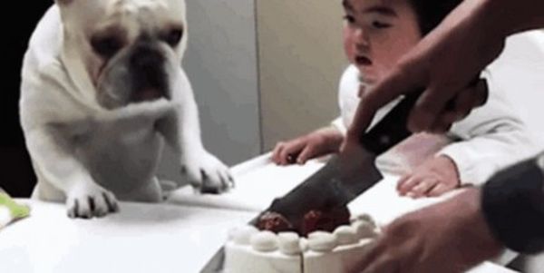 На протяжении короткого сюжета собака жалобно скулит в надежде, что ей дадут полакомиться десертом. /gazetavv/