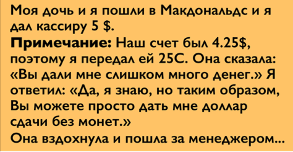 ИДИОТ 1. Моя дочь и я пошли в Макдональдс и я дал кассиру 5 $. Примечание: Наш счет был 4.25$, поэтому я передал ей 25С. Она сказала: «Вы дали мне слишком много денег.» Я ответил: «Да, я знаю, но таким образом, Вы можете просто дать мне доллар сдачи без монет.» Она вздохнула и пошла за менеджером, который попросил меня повторить мою просьбу. Я повторил, и он вручил мне обратно 25С, и сказал: ‘Мы сожалеем, но мы не делаем такого рода операции.’ Затем кассир дал мне сдачи 75 центов. Нет слов!
