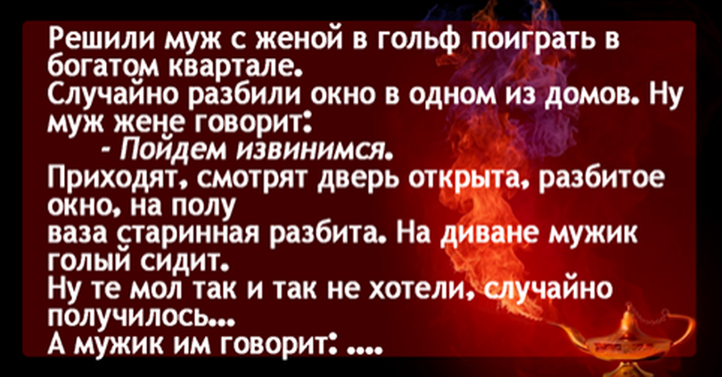 Приходят, смотрят дверь открыта, разбитое окно, на полу ваза старинная разбита. На диване мужик голый сидит. Ну те мол так и так не хотели, случайно получилось… А мужик им говорит:
