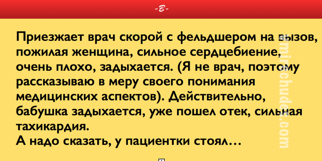 Приезжает врач скорой с фельдшером на вызов, пожилая женщина, сильное сердцебиение, очень плохо, задыхается. (Я не врач, поэтому рассказываю в меру своего понимания медицинских аспектов). Действительно, бабушка задыхается, уже пошел отек, сильная тахикардия.