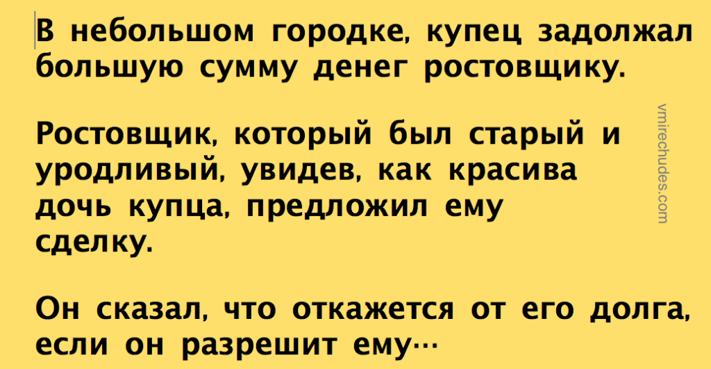 Много сотен лет назад в небольшом итальянском городке, купец задолжал большую сумму денег ростовщику.