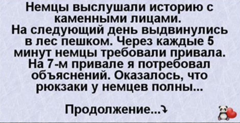 Немцы выслушали историю с каменными лицами. На следующий день выдвинулись в лес пешком. Через каждые 5 минут немцы требовали привала. На 7-м привале я потребовал объяснений. Оказалось, что рюкзаки у немцев полны перца и кирпичей. Избавившись от стройматериалов к обеду мы вышли охотиться на уток.