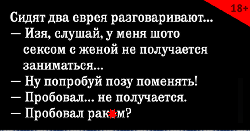 — Изя, слушай, у меня шото с@ксом с женой не получается заниматься…