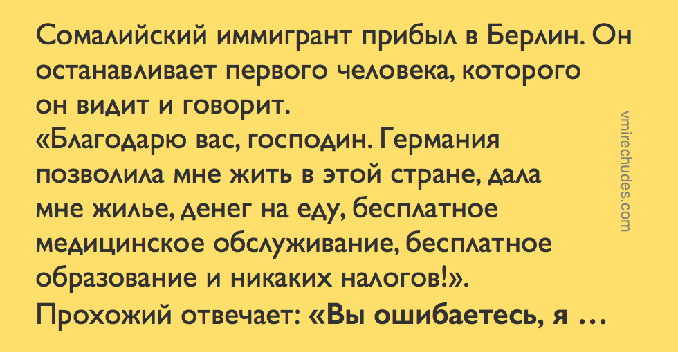 «Благодарю вас, господин. Германия позволила мне жить в этой стране, дала мне жилье, денег на еду, бесплатное медицинское обслуживание, бесплатное образование и никаких налогов!».