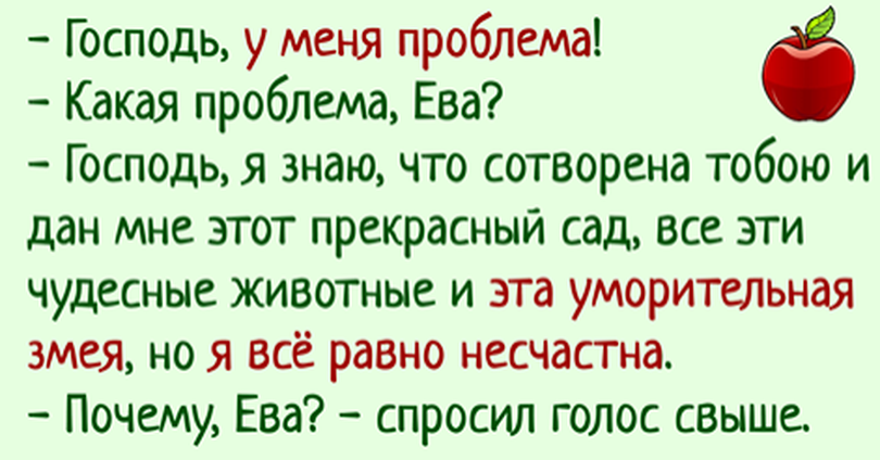 — Господь, я знаю, что сотворена тобою и дан мне этот прекрасный сад, все эти чудесные животные и эта уморительная змея, но я всё равно несчастна.