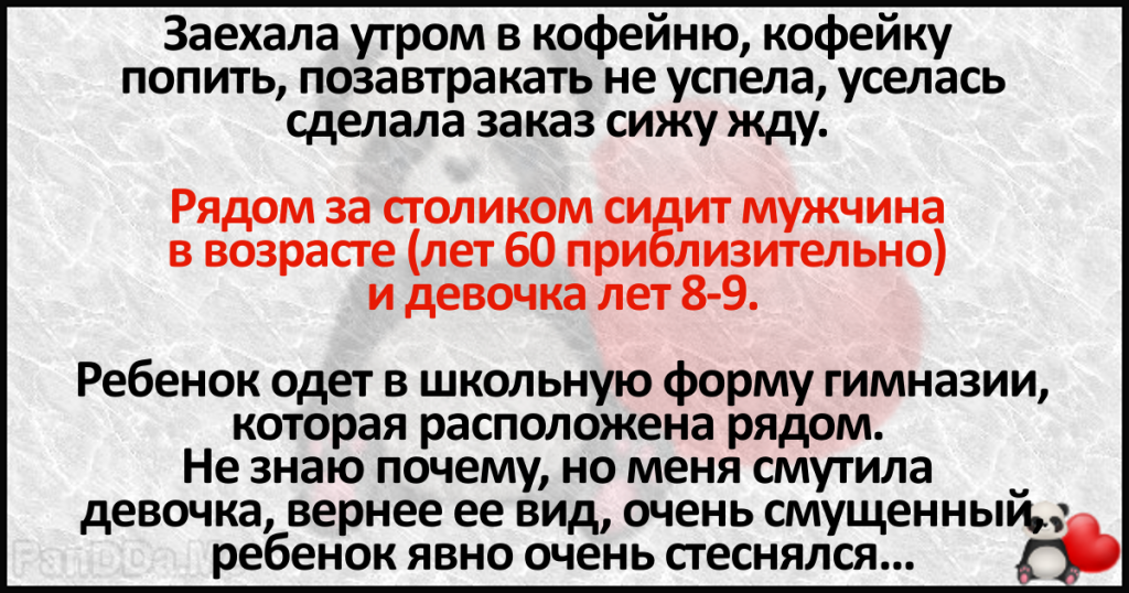 Сегодня стала свидетелем и частично участником ужасной ситуации и даже не ужасной, а очень и очень страшной. Заехала утром в кофейню, кофейку попить, позавтракать не успела, уселась сделала заказ сижу жду. Рядом за столиком сидит мужчина в возрасте (лет 60 приблизительно) и девочка лет 8-9.