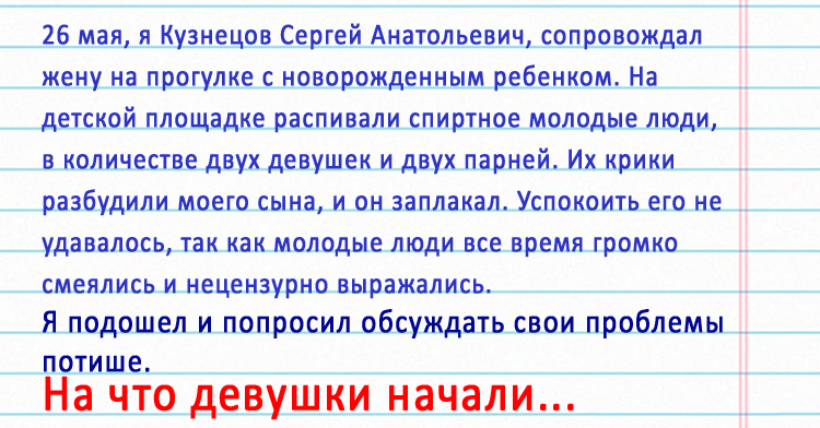 26 мая, я Кузнецов Сергей Анатольевич, сопровождал жену на прогулке с новорожденным ребенком. На детской площадке распивали спиртное молодые люди, в количестве двух девушек и двух парней. Их крики разбудили моего сына, и он заплакал. Успокоить его не удавалось, так как молодые люди все время громко смеялись и нецензурно выражались.