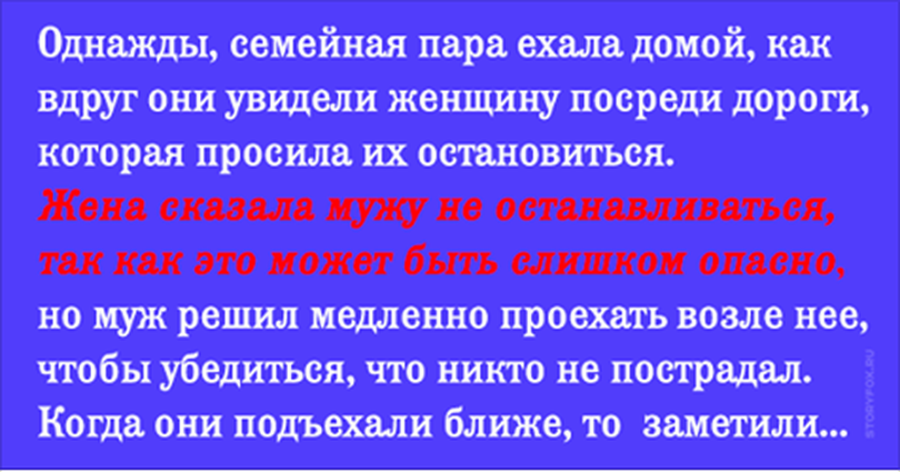 Жена сказала мужу не останавливаться, так как это может быть слишком опасно, но муж решил медленно проехать возле нее, чтобы убедиться, что никто не пострадал. Когда они подъехали ближе, то заметили, что лицо женщины было все в порезах и синяках. Тогда они решили остановиться и посмотреть, чем они могут помочь.