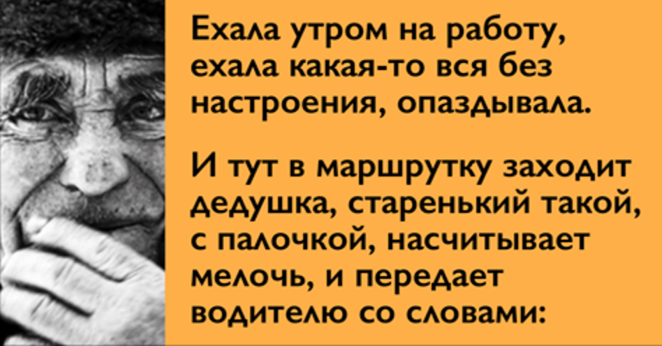 Дедушку такая реакция водителя, мягко говоря, удивила, да и остальных пассажиров тоже. Я чаще всего вижу недовольных и ворчливых маршрутчиков, а тут такая сердечность и доброта! Дедушка забрал свою мелочь и тихонько сказал: «Спасибо». Перед тем, как выйти на своей остановке, он снова поблагодарил водителя, на что тот ответил: «Не за что! Будь здоров, отец!».