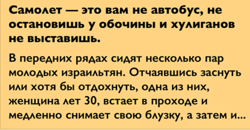 Все религиозные сразу притихли, прикрывая глаза, свои и детей. В воцарившейся тишине молодая женщина громко говорит, что если в самолете не будет тишины, она снимет и штаны тоже. Ее друзья обещают сделать то же самое.
