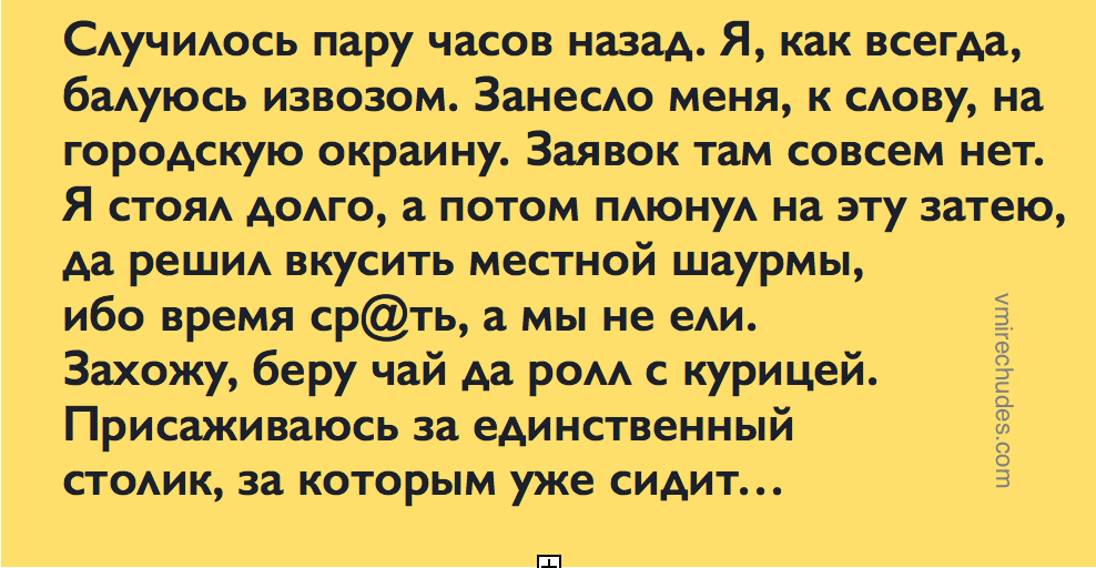 Случилось пару часов назад. Я, как всегда, балуюсь извозом. Занесло меня, к слову, на городскую окраину. Заявок там совсем нет. Я стоял долго, а потом плюнул на эту затею, да решил вкусить местной шаурмы, ибо время срать, а мы не ели.