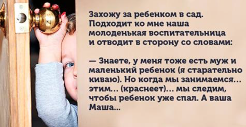 — Знаете, у меня тоже есть муж и маленький ребенок (я старательно киваю). Но когда мы занимаемся… этим… (краснеет)… мы следим, чтобы ребенок уже спaл… А ваша Маша — достаточно умненькая… И может притворяться, а сама наблюдать за вами…