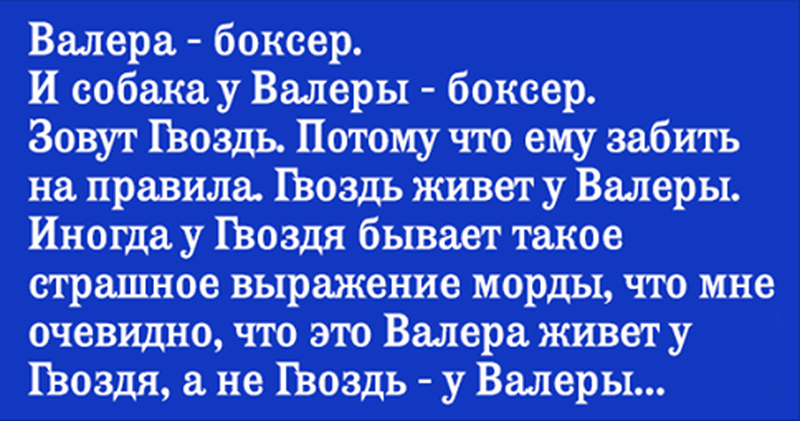 — Хочешь, мы его накажем? — спросил Валера, внезапно возникший передо мной. У него играли желваки. Гвоздь тяжело дышал рядом, готовый к мести. Я испугалась, хотела сказать»Не надо», но Валера не стал ждать моего ответа. К Ивану Васильевичу подошла процессия из Валеры и Гвоздя. Случилась экспрессия. Иван Васильевич сразу сменил профессию. И агрессию на депрессию.