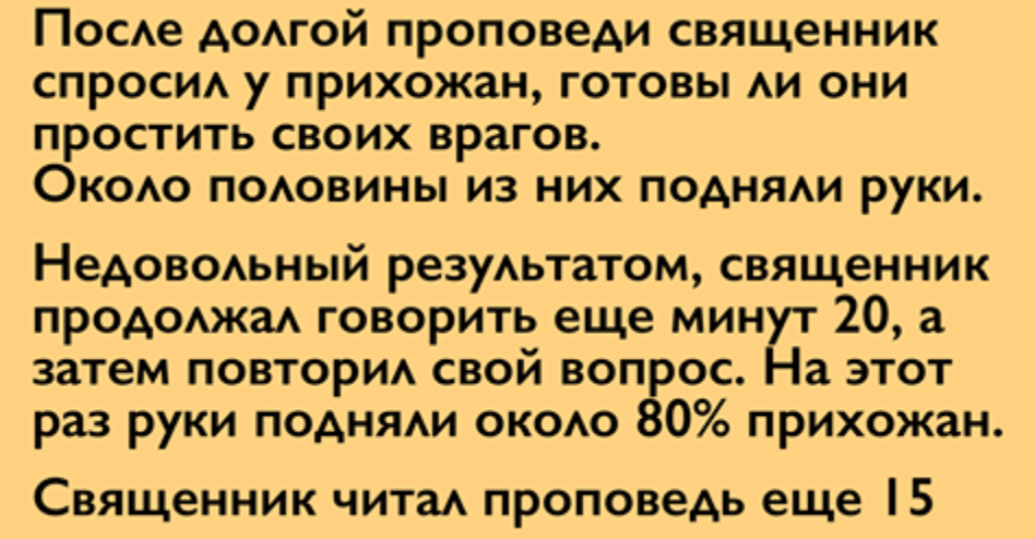 После долгой проповеди священник спросил у прихожан, готовы ли они простить своих врагов. Около половины из них подняли руки.