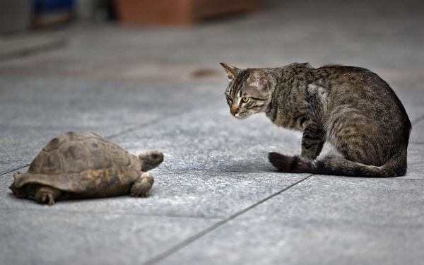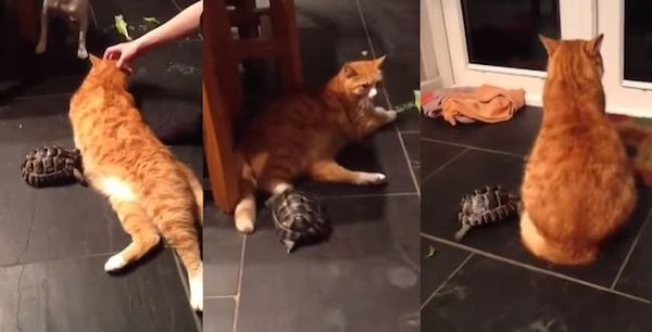 Только посмотрите, что эта озорная черепаха вытворяет с котом. Невероятные отношения…