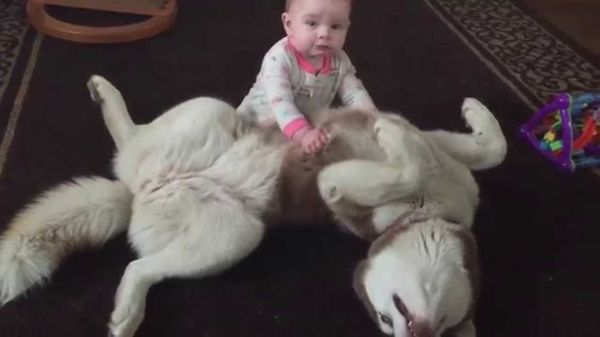 Этот сибирский хаски получает нескрываемое удовольствие от общения с ребенком. Похоже, он готов...