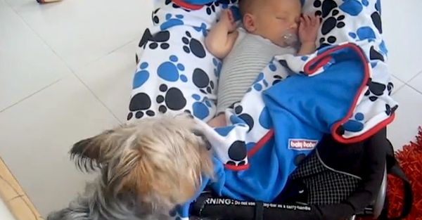 Очаровательный йоркширский терьер не смог спокойно смотреть, как мёрзнет спящий ребёнок и поспешил...