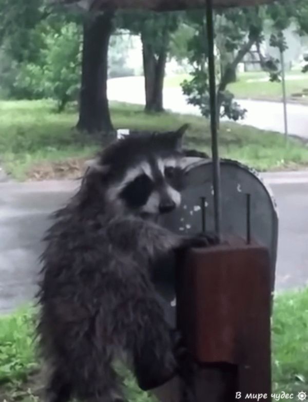 Этот милый енот пытается спрятаться от дождя под зонтиком от почтового ящика. Промокший...