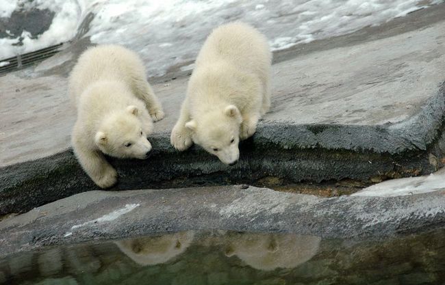 Два белых медвежонка играют на снегу, пока их мама сидит в берлоге.