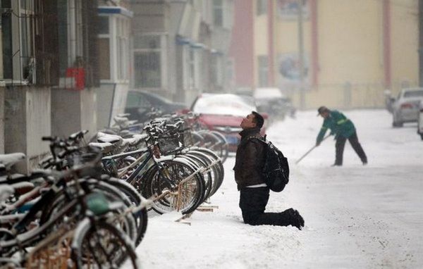 Один влюбленный китаец вымаливал прощение, стоя на коленях на заснеженной улице перед окнами...