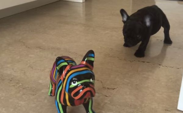 Хозяйка этого уморительного бульдожка, купила игрушечную копию. Но похоже, что малыш не оценил...