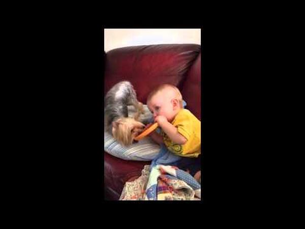 Маленький ребенок и йоркширский терьер вступили в схватку за «летающую тарелку». Оба крепко...