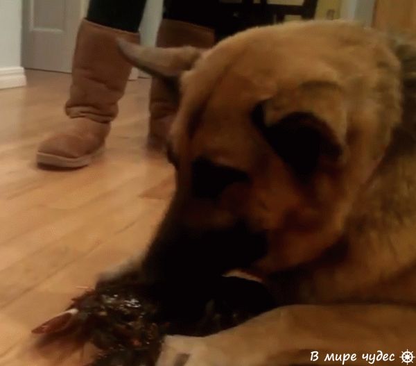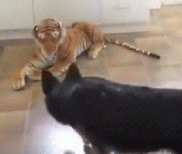Немецкая овчарка знакомится с игрушечным тигром. Пес всерьез думает, что тигр реальный! Смотреть...