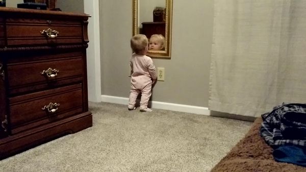 Эта малышка мило рассматривает себя в зеркале. Похоже она влюблена в свое отражение....