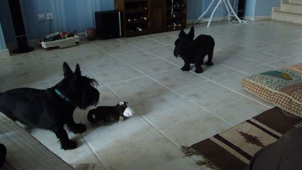 Веселый ролик о том, как шотландские терьеры увидели хихикающую игрушку обезьяны.